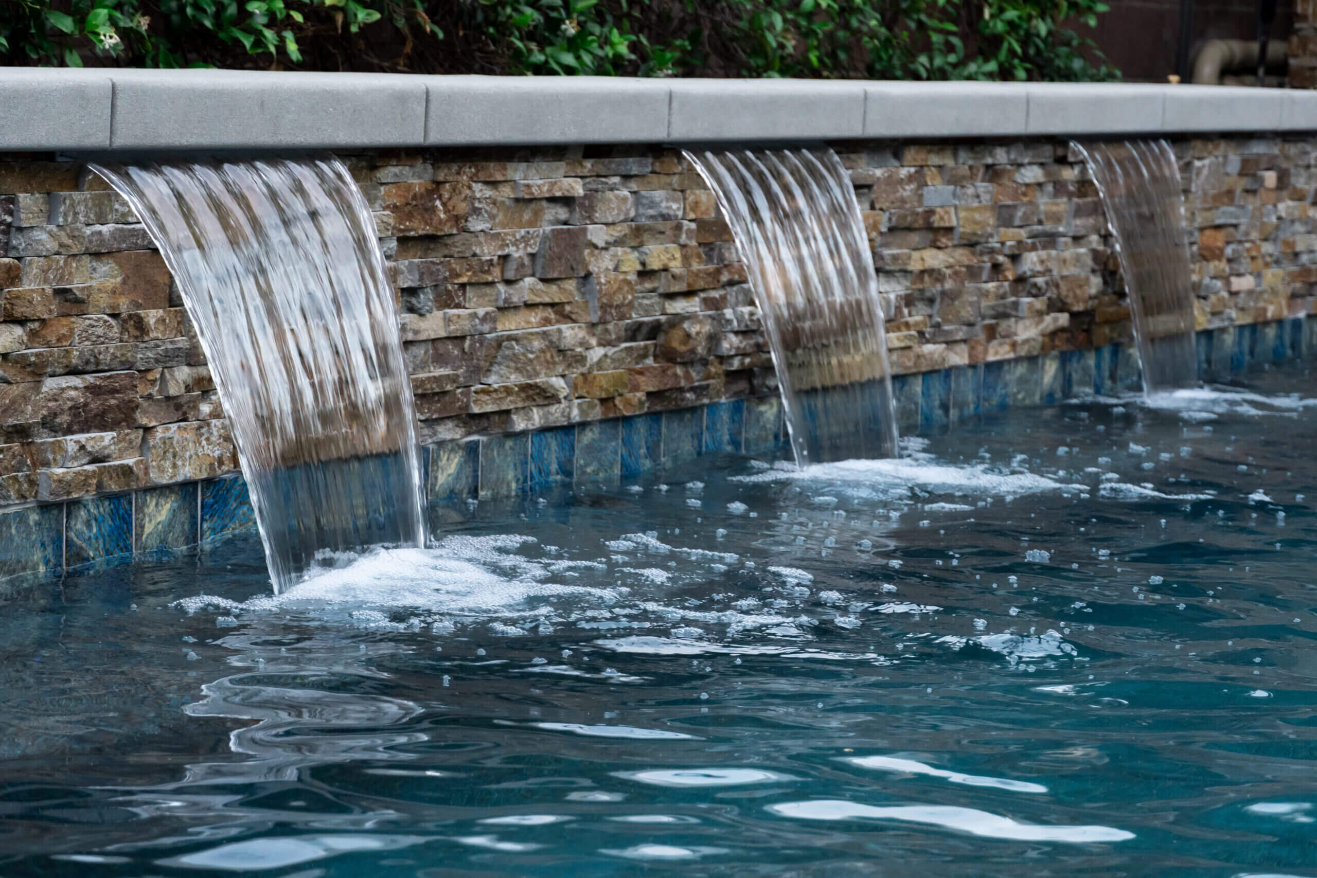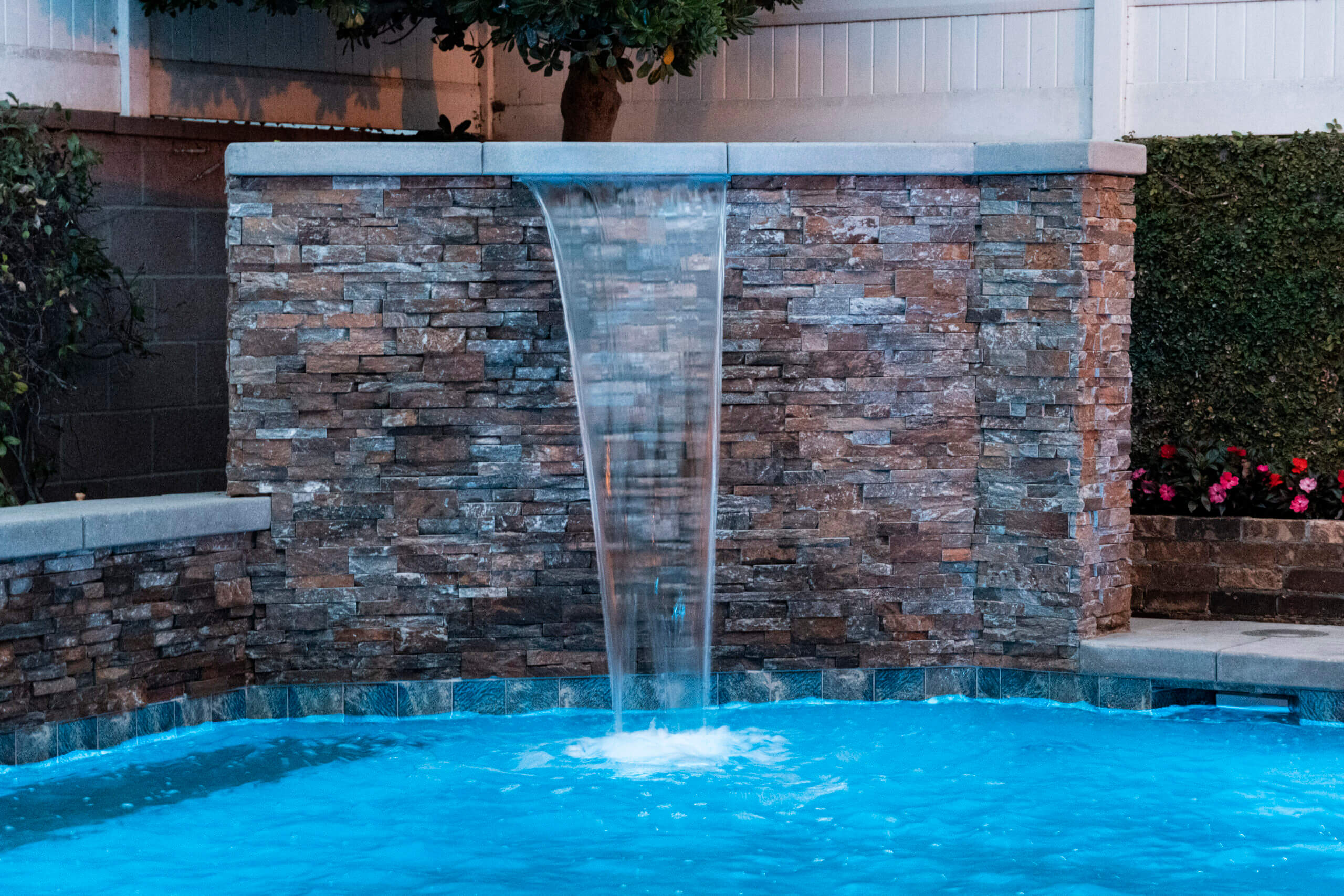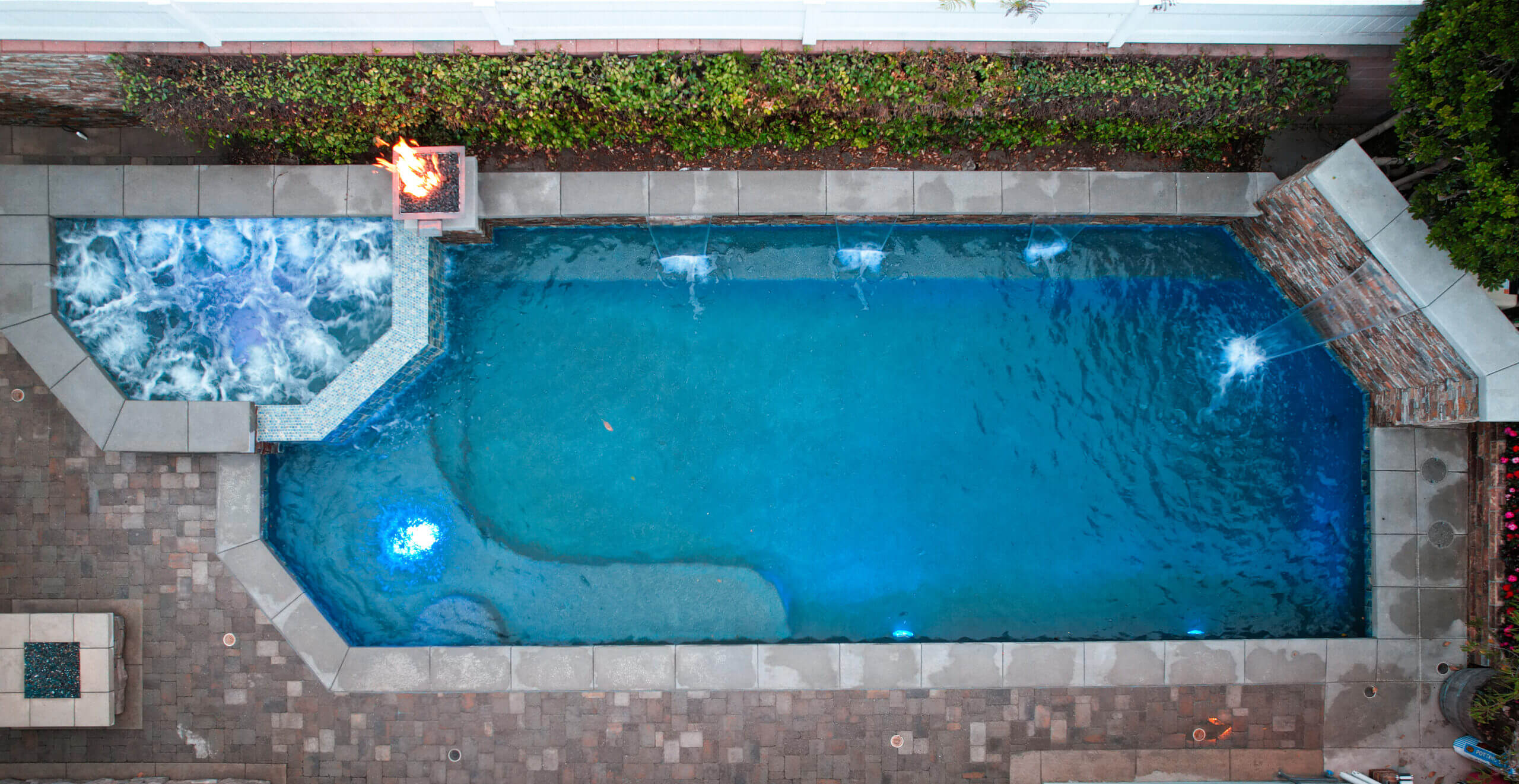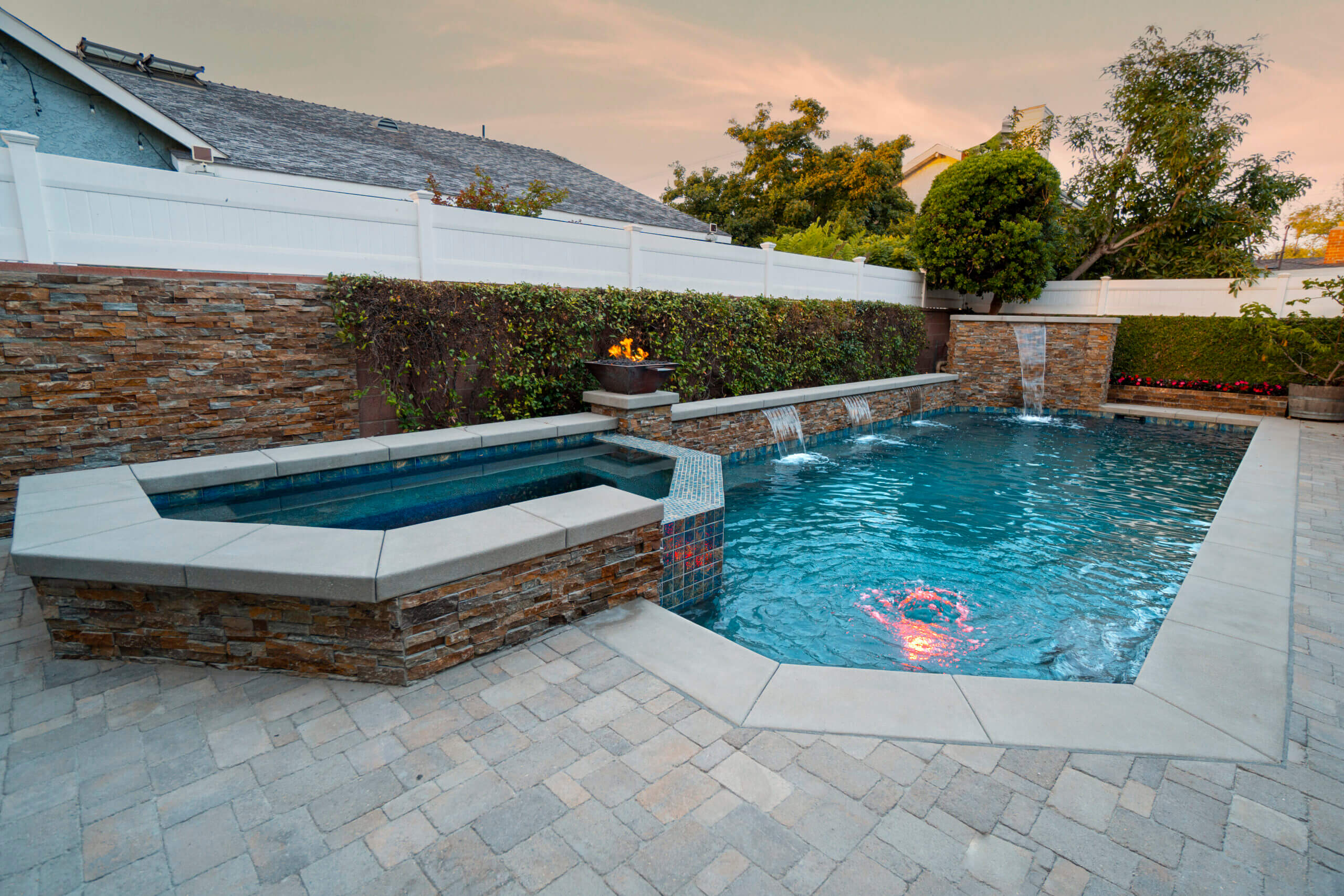 This Long Beach custom-shaped pool is designed with beautiful water features all around, including a fire bowl water feature that makes it truly unique. The large baja allows for easy access into the pool, while the long bench across the length of the pool is both relaxing and accessible. The pool is made with midnight blue mini pebble that is both unique and long lasting. The large, raised Spa is designed with 12 remote-controlled jets, ideal for big parties.
