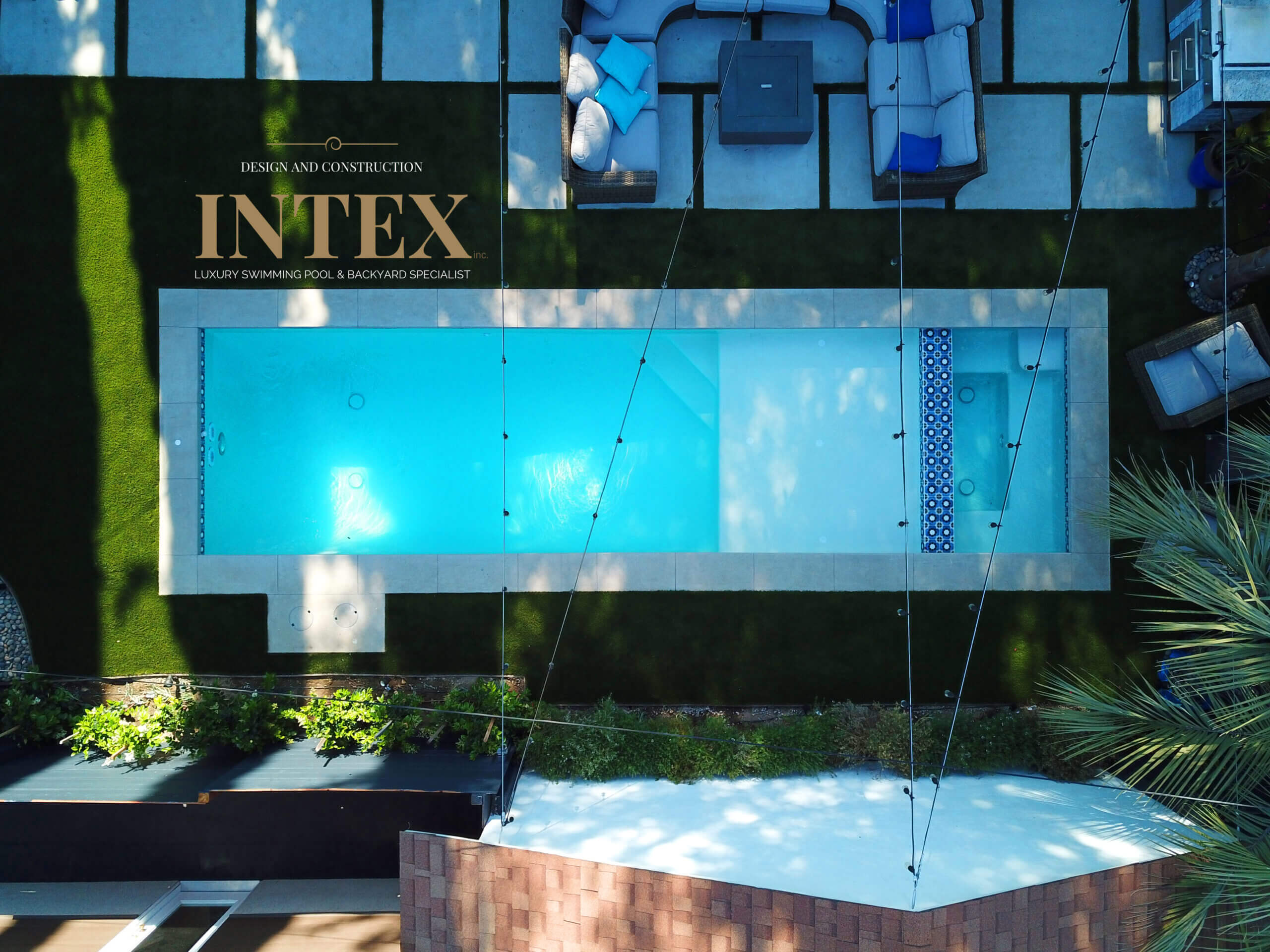 This modern pool is coupled with a zero-edge spa and various custom-designed features. There is a raised black-stone wall with a water feature, Baja shelf steps with bubbler water fountains, and a custom-designed stool in the water. A beautiful IPE wood sundeck extends over the pool, making it ideal for long days spent by the pool.