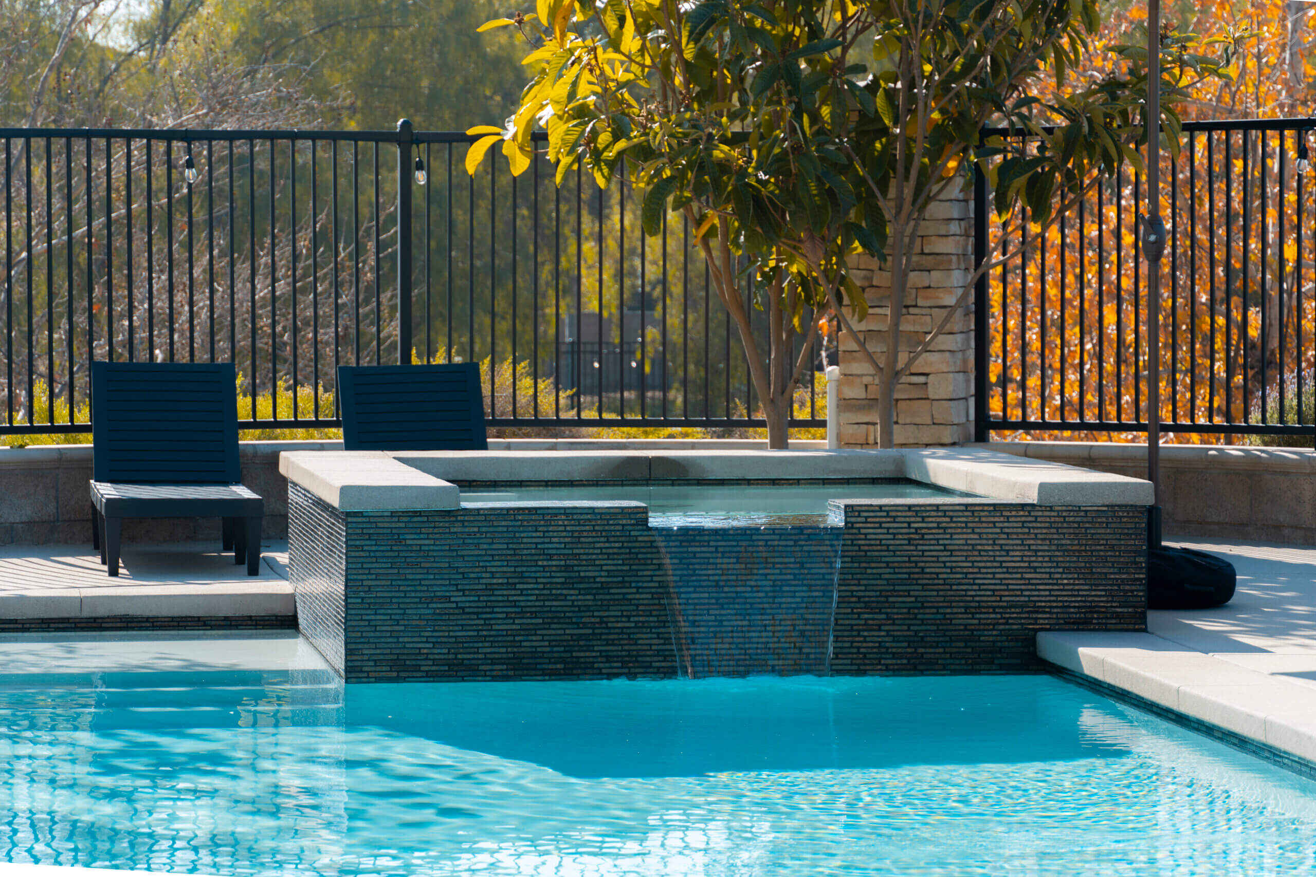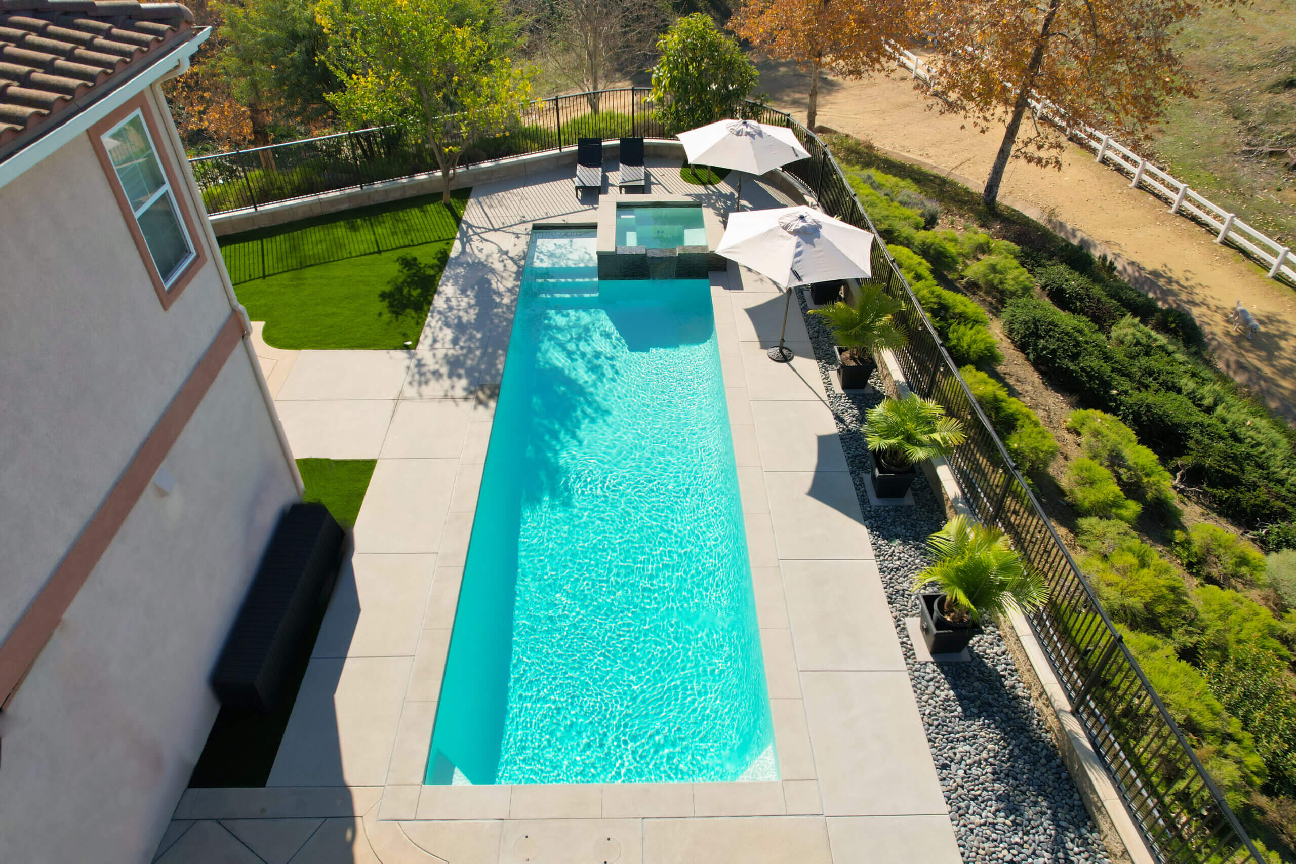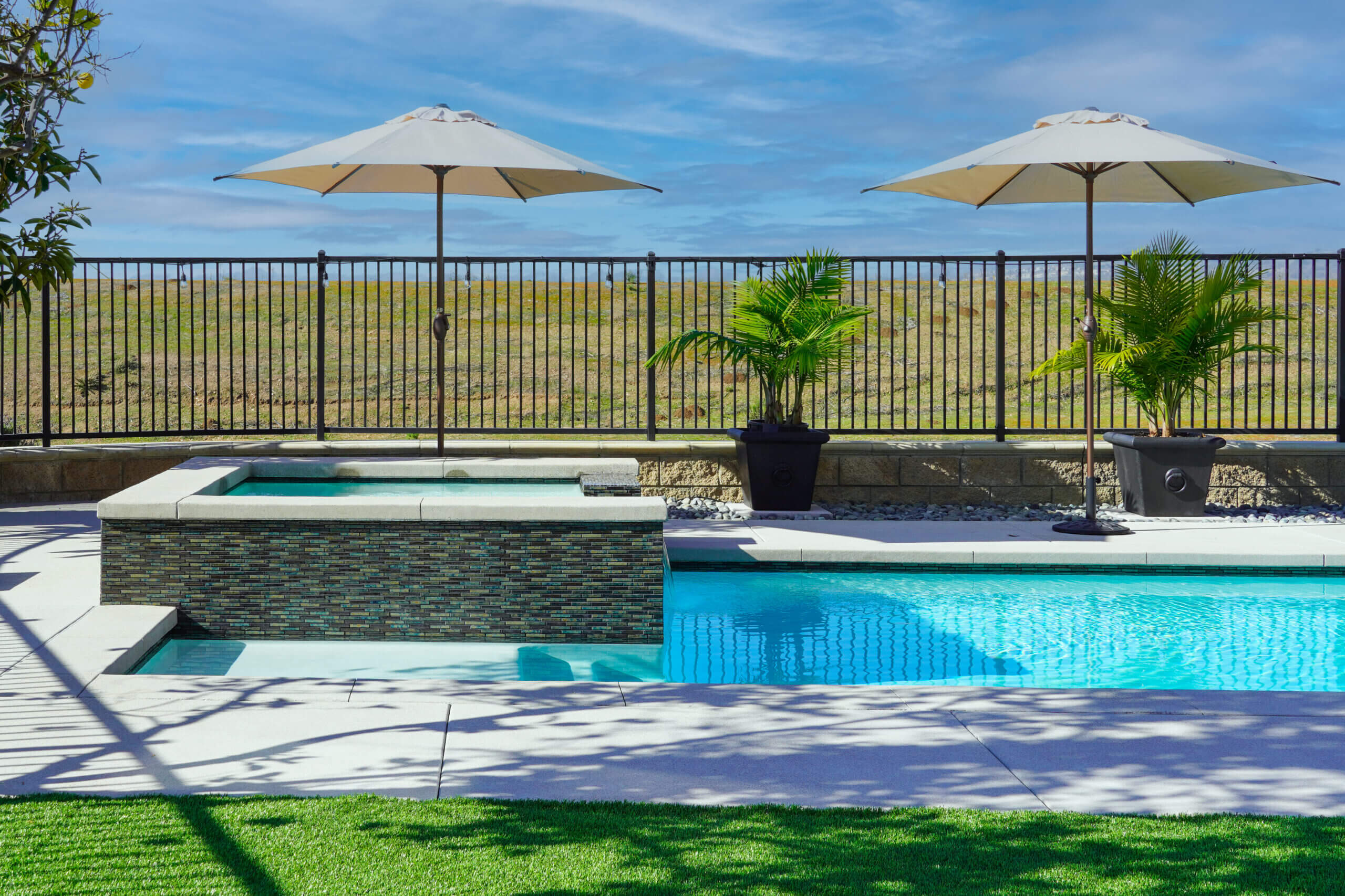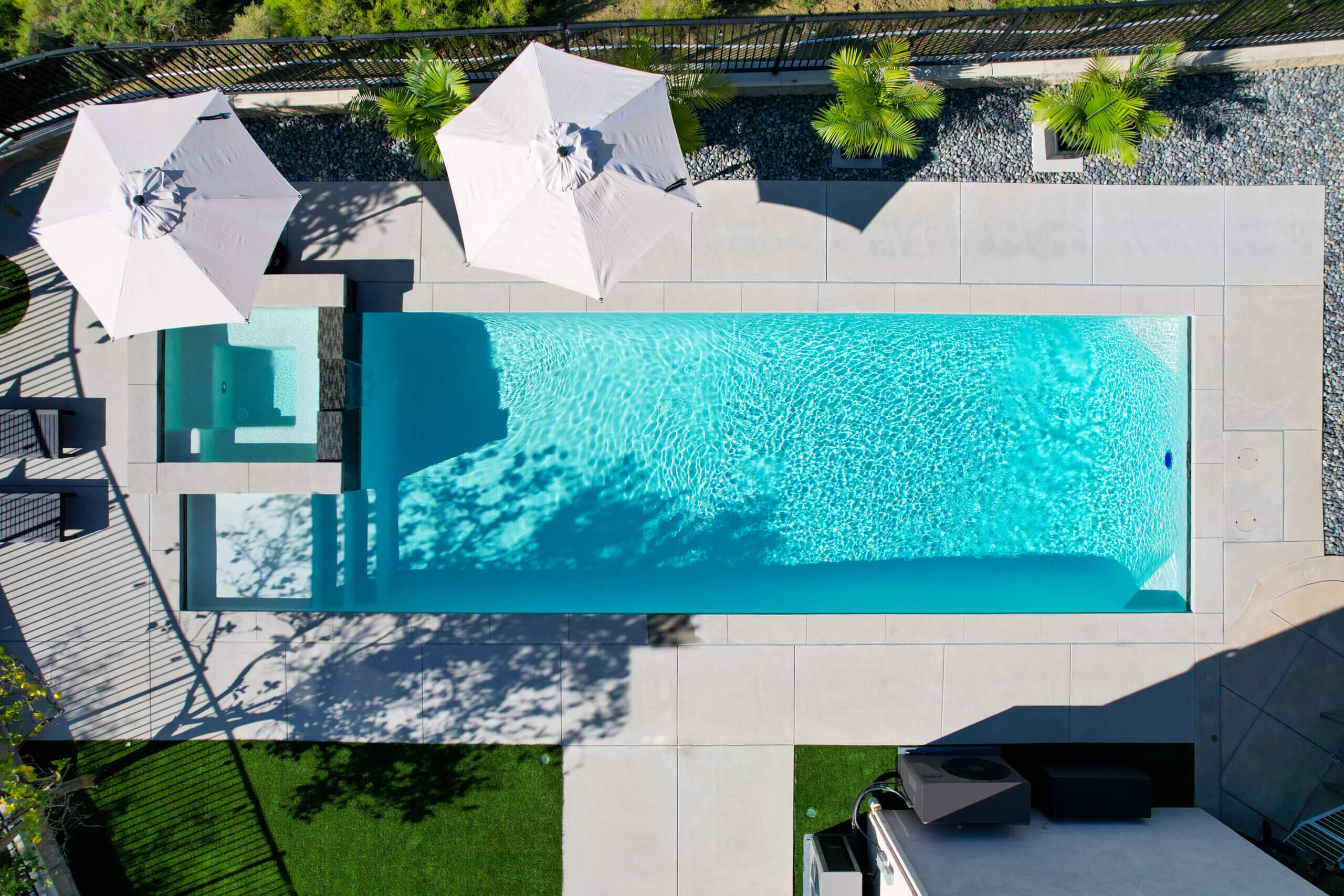 The client wanted a lap pool that is both functional and beautiful, and that is exactly what we created. A mini baja allows for easy access into the pool while the corner benches allow for a much-deserved rest after several laps. The Spa is complete with a beautiful spillway water feature, and the entire pool is designed with neat and modern concrete coping.