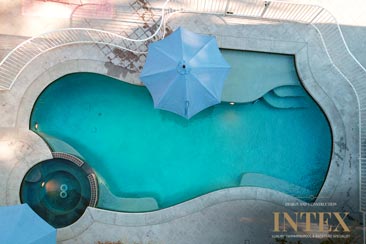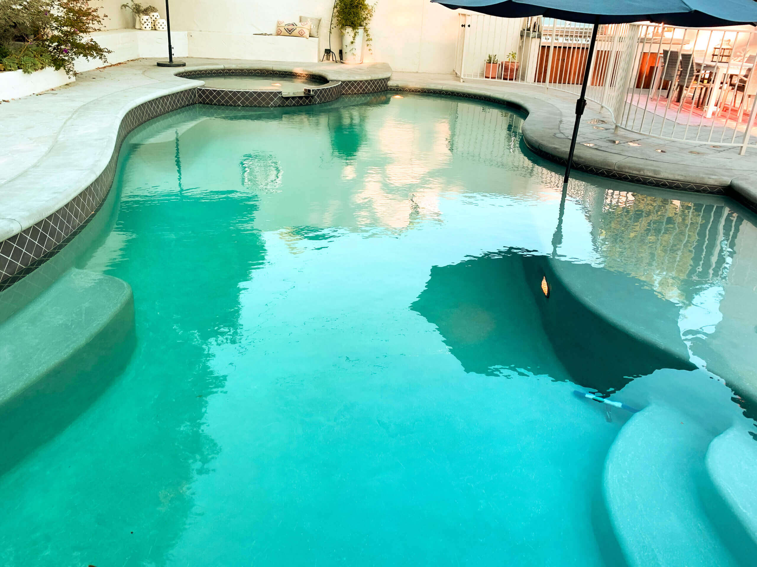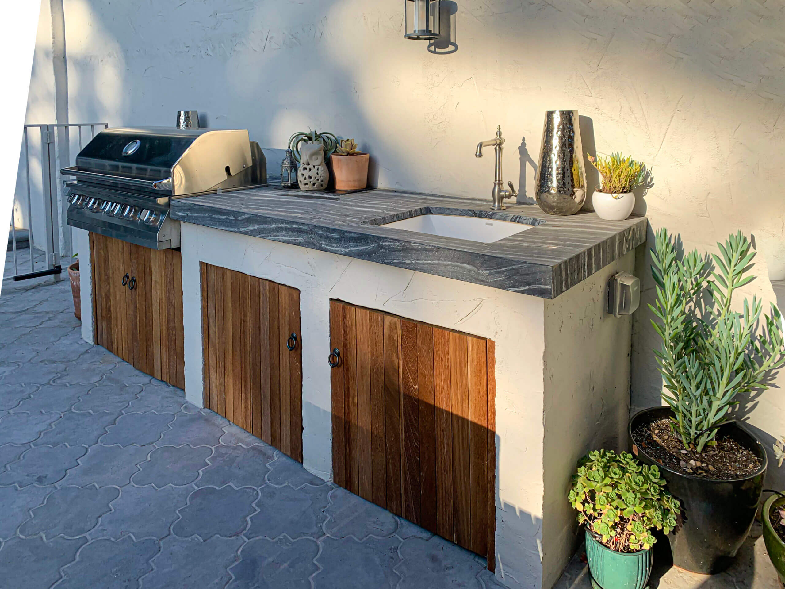 This Mediterranean pool is designed with a beach entry for ease of access, with no steps needed– you walk into the pool like you would into the ocean. The spa is raised and will give the clients the sound of water as the water flows from the spa into the pool from both sides. We have used natural stone for the entrance of the pool, simple light tiles for the water line, and the coping is a light gray, sand finish concrete. The backyard is designed for both small and large gatherings by the fire pit and the BBQ. The fire pit and BBQ are covered in smooth white stucco for comfort and elegance.