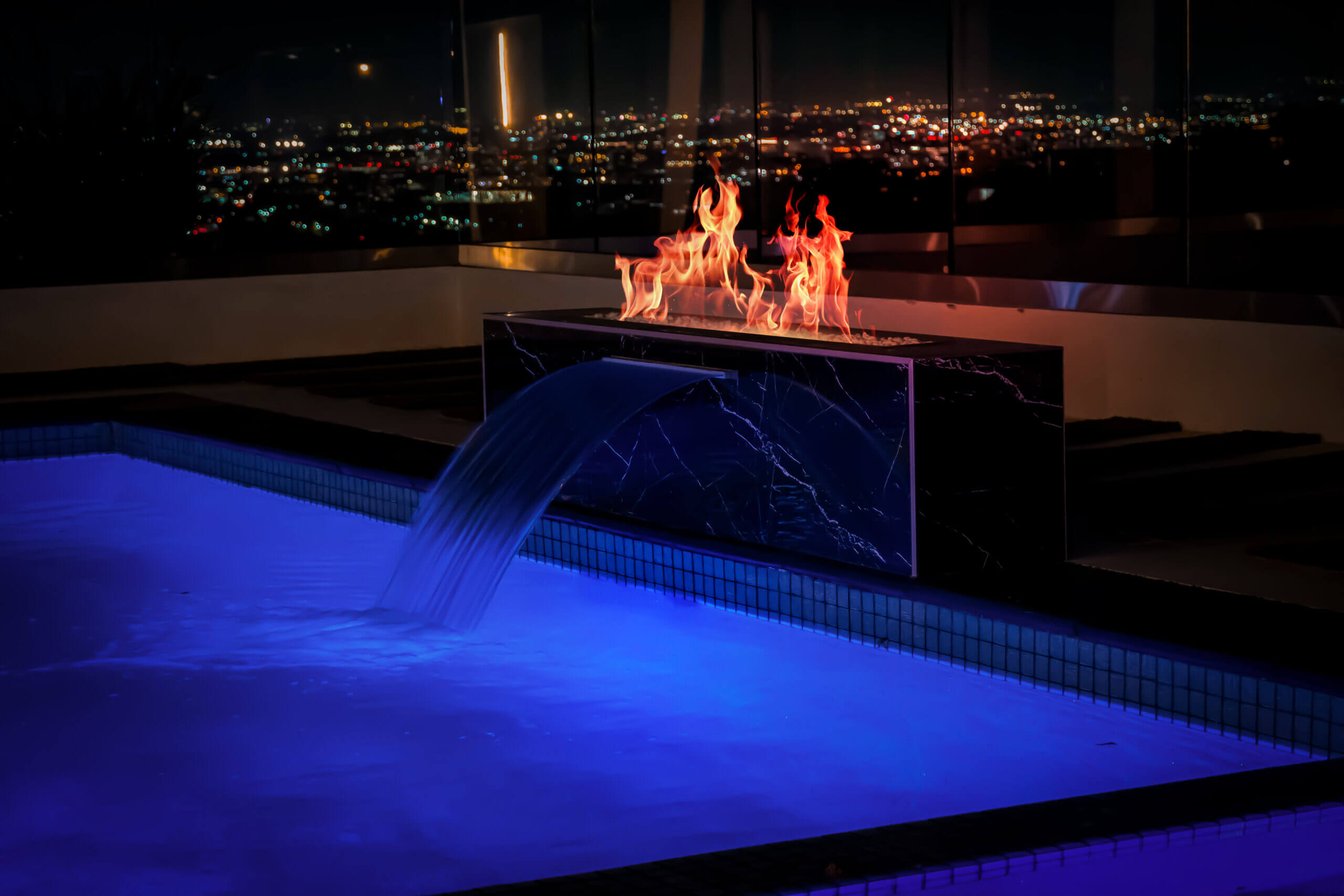 Welcome to our extraordinary rectangular pool overlooking the captivating Corona Del Mar hillside. Immerse yourself in the perfect harmony of fire and water as you relax in the embrace of our large spa. Witness the mesmerizing interplay of flames dancing atop the water’s surface, creating a stunning visual spectacle.
