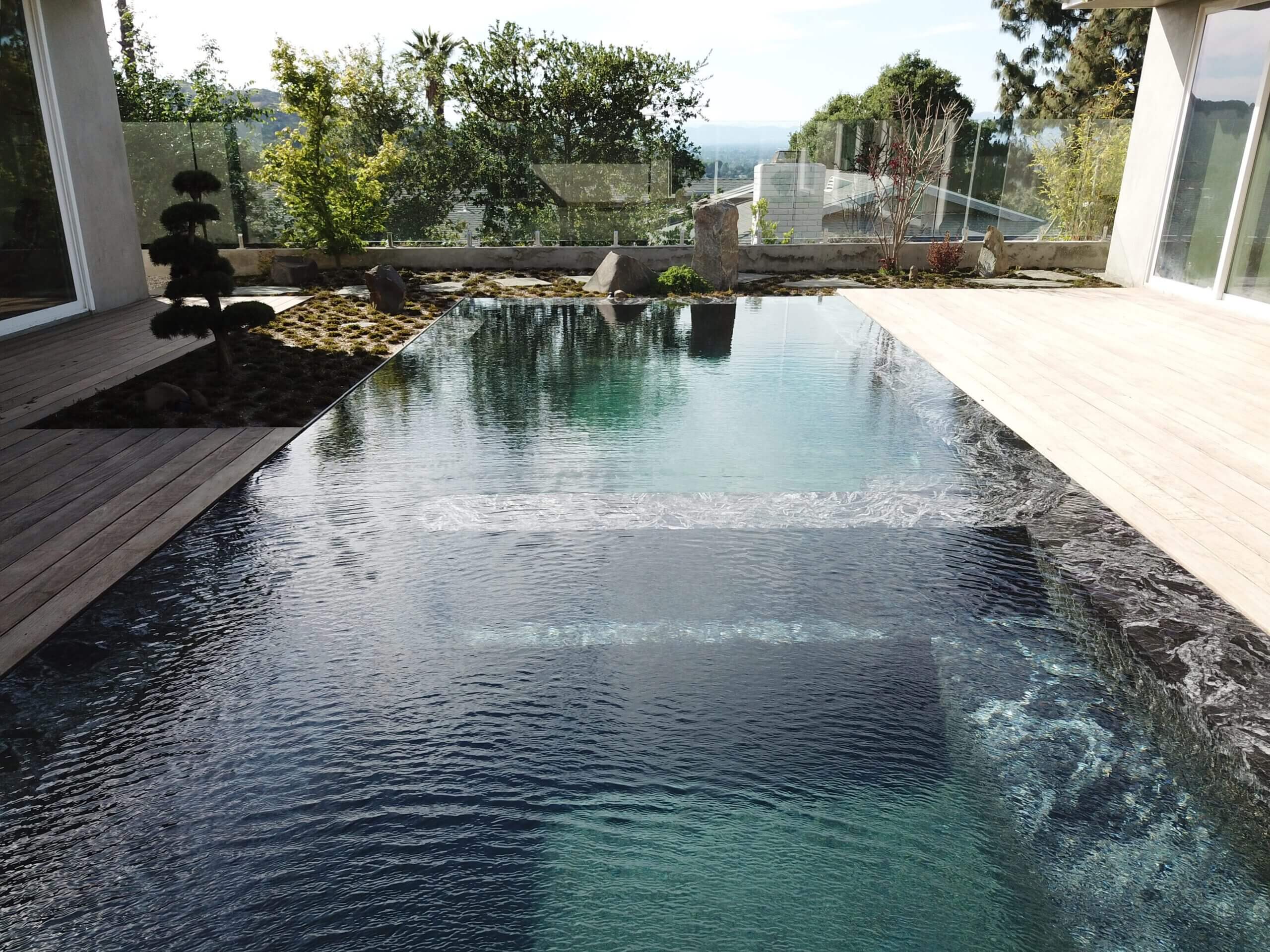 This pool is designed as a zero-edge pool, on top of the hills in Studio City. Water level is the same as the deck, with custom stone fabrication for the water line. The pool is surrounded by IPE wood decking for its color and look, surrounded by drought-resistant landscaping. We used gorgeous black quartz for the bottom of the pool. The seats and steps of the pool and spa are also covered in stone.